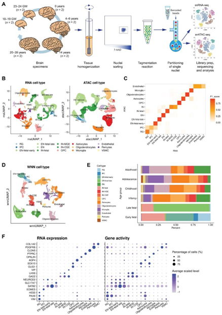 本项研究对来自 6 个发育时期(妊娠早期中期,妊娠晚期,婴儿期,儿童期,青春期,成年期)的 12 个人类新皮质样本进行了单细胞核转录组分析(snRNA-seq)和单细胞核染色质可及性测序(snATAC-seq)分析(图1A)。
