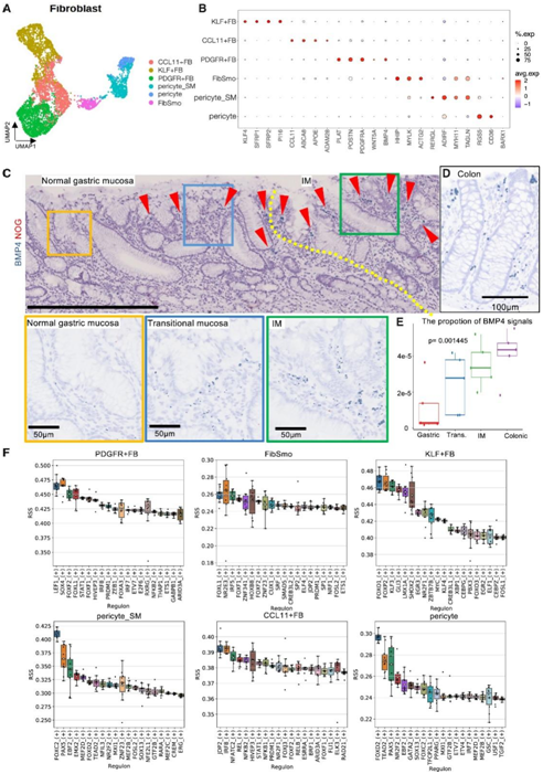 (A) UMAP 显示 FB 亚聚类。(B) FB 亚聚类的代表性标记基因。(C) 正常胃黏膜和肌内黏膜(包括它们之间的移行黏膜)中 BMP4 的 RNA-ISH。(D)结肠黏膜中BMP4的RNA-ISH。(E) 每个腺体黏膜表面基质区域中 BMP4 绿色信号的比例。(F) 箱线图显示每个 FB 聚类中基因调控网络分析的结果。