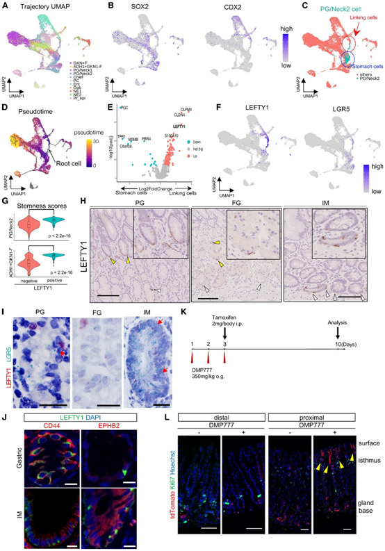 (A) UMAP 显示图 1 E 中所示的每个亚聚类。(B)表层细胞中的谱系相关基因表达(分别为胃谱系的SOX2和化生谱系的CDX2)。(C) UMAP 显示 PG/neck2 细胞的分布。(D) UMAP 图上显示的伪时间轨迹分析。(E) 火山图显示 (C) 中所示的两个 PG/neck2 细胞组之间差异最大的基因(“连接细胞”和“胃细胞”)。(F) Epi 细胞中 LEFTY1 和 LGR5 的表达。(G)每个 PG/neck2 细胞聚类和 ADH1+ GKN– F细胞聚类中 LEFTY1+ 和 LEFTY1– 细胞的干细胞评分。(H) 人胃中 LEFTY1 的 IHC分析。(I) LEFTY1(红色)和 LGR5(绿色)的 RNA-ISH。(J) 肠化生和胃黏膜中 LEFTY1(绿色)和 CD44/EPHB2(红色)的 IF。(K) 他莫昔芬和 DMP-777 的治疗方案。(L)小鼠的近端胃和远端胃进行 IF 染色。