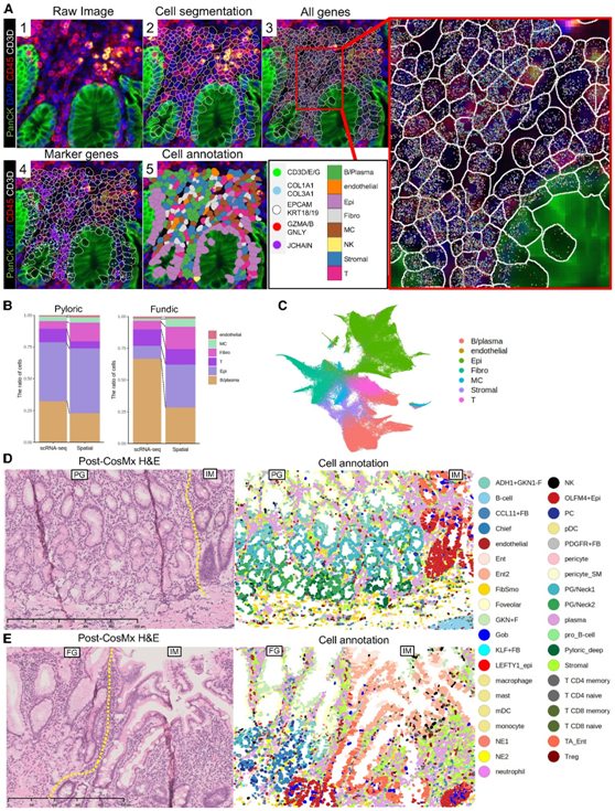 为了创建包含空间信息的综合人类胃细胞图谱,他们采用了空间单细胞成像分析(CosMx)。该技术能够以亚细胞分辨率对约1000 个 RNA 靶标进行分析。