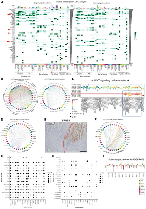 (A) 基于空间转录组数据集的每种细胞类型之间细胞间相互作用的整体视图。(B、D、F) 通过 CCC 分析确定的代表性特征交互网络。(C) ncWNT 信号通路网络的详细信息。(E) 正常胃黏膜和肌内黏膜边界的 ERBB3 的 IHC。(G-H)点图显示了相互作用改变基因(ICG)的总数,定义为在“源细胞”中表达的基因数量,这些基因根据与“邻近细胞”的空间距离的变化而变化。(I) PDGFR+ FB 中相对于各种邻近外延细胞类型的基因表达水平的变化。