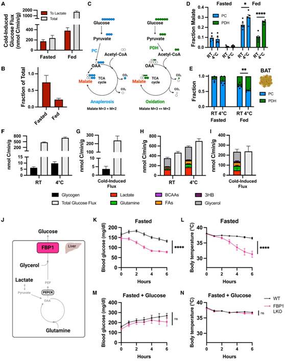 (A)寒冷诱导禁食或自由进食的小鼠中从葡萄糖到乳酸的通量和总葡萄糖通量的增加。(B) 寒冷引起的葡萄糖通量增加的比例。(C) 示意图显示通过丙酮酸羧化 (PC) 或丙酮酸脱氢酶 (PDH) 氧化从葡萄糖到苹果酸的碳示踪。(D)在室温 (RT) 或 4°C 下禁食和自由进食的小鼠的 BAT 中,通过 PC 或 PDH 通量从葡萄糖衍生的苹果酸分数。(E) BAT 中通过 PC 与 PDH 途径转化为苹果酸的总葡萄糖流量的比例。(F) 与禁食小鼠在 RT 或 4°C 下的总葡萄糖通量相比,3 至 6 小时糖原净减少导致的葡萄糖通量变化。(G) 寒冷引起的糖原葡萄糖通量和总葡萄糖通量的增加。(H) 各种营养素到葡萄糖的通量与室温或 4°C 下饲养的禁食小鼠的总葡萄糖通量相比。(I) 寒冷导致各种营养素到葡萄糖的通量和总葡萄糖通量增加。(J) 示意图显示肝脏中 FBP1 介导的糖异生。(K-L) FBP1肝脏敲除(FBP1 LKO)和对照组(WT)小鼠急性应激于4°C无食物环境下的血糖水平和体温。(M-N) 急性应激于 4°C 且不进食但饮用水中含有 15% 葡萄糖的 FBP1 LKO 和 WT 小鼠的血糖水平和体温。