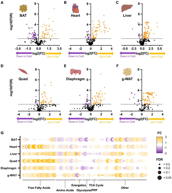 (A-F)火山图比较小鼠在4°C和RT下 BAT、心脏、肝脏、股四头肌(Quad)、膈肌和性腺WAT (g-WAT)中的代谢物水平。(G)差异倍数(FC)和错误发现率(FDR)。