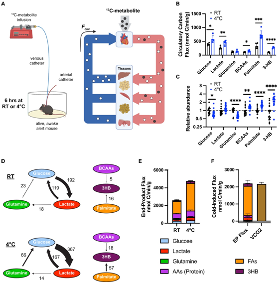 (A) 演示13 C-代谢物输注系统的模型。(B-C)在室温(RT)或急性应激于4°C而不进食的小鼠中,动脉血浆中关键代谢物的循环碳通量和代谢物丰度。(D)选择循环养分之间的绝对通量,单位为nmol C/min/g。(E)小鼠在RT或4°C时关键代谢物的终产物通量率。(F)寒冷诱导的最终代谢通量率和VCO2的增加。