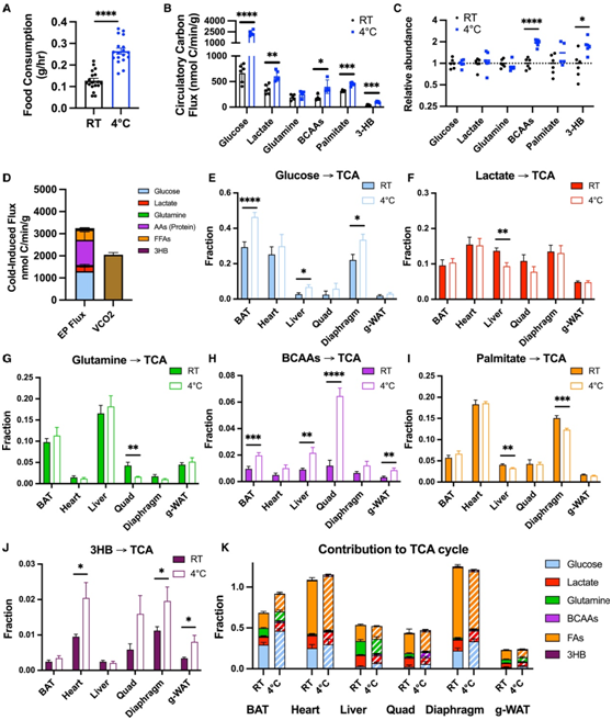 (A) 在室温 (RT) 下饲养或急性应激于 4°C 6 小时的自由进食小鼠的食物消耗。(B-C) 循环碳通量和动脉血浆中关键代谢物的代谢物丰度。(D)自由采食期间寒冷诱导的最终代谢通量率和 VCO2的增加。(E–K)葡萄糖、乳酸、谷氨酰胺、支链氨基酸、棕榈酸盐、3-羟基丁酸盐和所有营养素的直接贡献。