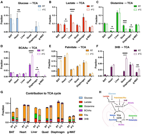 接下来,为了研究寒冷应激如何影响单个器官的营养素使用,他们检测了每次标记营养物输注后不同组织中TCA循环代谢物的13 C 分数富集,以计算源自每种营养物的 TCA 循环碳分数(图4A-F)。