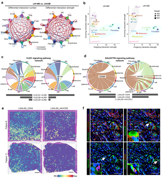 (a) 比较 LN + AM 和 LN - AM之间 13 种注释细胞类型的差异相互作用数量和强度。 (b) 散点图显示了 LN – AM 和 LN + AM 中 13 种注释细胞类型的传入和传出相互作用强度。 (c-d) 弦图显示了LN + AM 和 LN - AM 中所选的 CLEC和 GALECTIN信号通路网络。 (e) 使用 ST-seq 数据展示患者 6 和患者 11 组织切片中选定 LR 对的相互作用活动的空间特征图。 (f) 通过多重 IHC 测定捕获的AM 队列中 LR 对(Galectin-9_CD44、Galectin-9_TIM-3 和 Galectin-9_CD45)的代表性图像。
