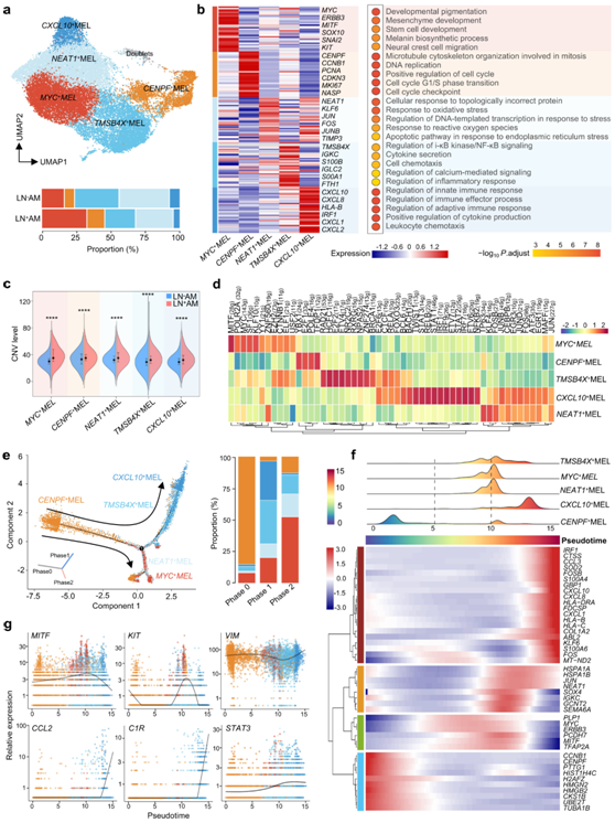 (a) 所有黑色素瘤细胞的 UMAP图均按带注释的亚聚类进行颜色编码,条形图显示这些带注释的亚聚类源自 LN+AM 和 LN-AM 患者的比例。(b) 热图(左)显示聚类特异性基因,点图显示(右)这些带注释的黑色素瘤亚聚类相应富集的生物学功能。 (c) 分割小提琴图,说明由 LN-AM 和 LN + AM着色的注释亚聚类的 CNV 水平。(d) 热图显示带注释的黑色素瘤亚聚类中关键转录因子的表达。(e) 对这些 AM 细胞的伪时间排序分析(左)识别出两种不同的细胞命运,并按亚聚类着色。 (f) 热图显示基因表达沿伪时间的动态变化。(g) 二维图显示选定基因沿伪时间的动态表达,按亚聚类着色。