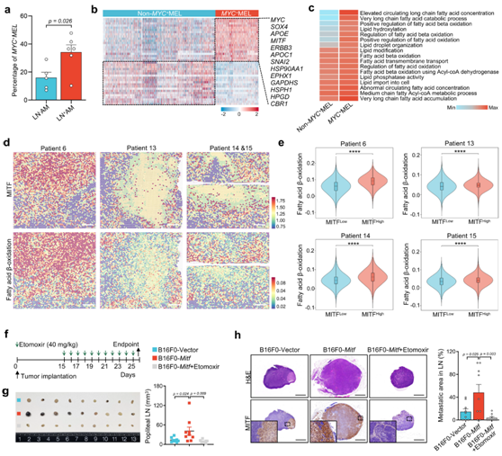 (a) 直方图显示了LN–AM和 LN+A组中MYC+MEL 细胞的比例。 (b) 用 scRNA-seq 数据显示MYC + MEL 组与非MYC + MEL 组中选定 DEG 表达水平的热图。 (c) 热图显示MYC + MEL 和非MYC + MEL 组中脂肪酸代谢相关途径。 (d) 空间特征图显示所选组织切片中MITF表达和 FAO 评分。(e) 小提琴图显示每个组织切片中MITFHIGH和 MITFLOW之间的 FAO 分数。 (f) Etomoxir在C57BL/6小鼠肿瘤植入模型中的治疗方案。(g) 腘窝淋巴结大体外观图像,以及B16F0-Vector、B16F0-Mitf和B16F0-Mitf+Etomoxir组腘窝淋巴结大小散点图。(h) 腘淋巴结的 H&E 和抗 MITF 染色图像。