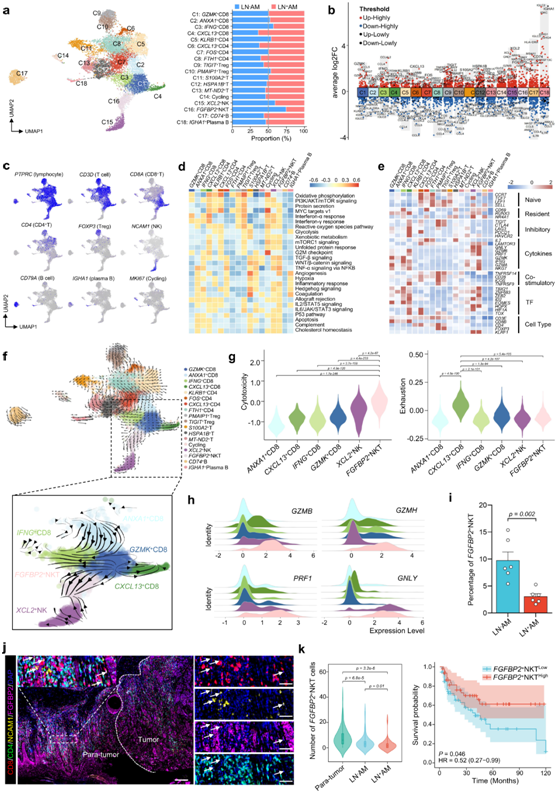 (a) UMAP图(左)显示免疫细胞,条形图(右)显示 LN + AM 和 LN-AM 组中每个亚聚类的比例。(b) 火山图显示带注释的免疫细胞亚聚类中的 DEG。 (c) 用于亚聚类注释的经典标记基因的特征图。 (d) 对这些亚聚类中选定的标志路径进行 GSVA 分析。 (e) 热图显示这些亚聚类中选定基因集[包括幼稚基因组、常驻基因组、抑制基因组、细胞因子、共刺激基因、转录因子 (TF) 和细胞类型]的表达。(f) RNA 速度分析展示了这些亚聚类的进化轨迹。(g) 小提琴图显示所选亚聚类中的细胞毒性和耗竭分数。 (h) 岭图显示这些亚聚类中GZMB、GZMH、PRF1和GNLY的表达水平。(i) 使用显示LN+ AM和 LN – AM组中FGFBP2 + NKT 细胞比例的直方图。 (j)多重IHC分析。 (k) 小提琴图(左)显示肿瘤旁组、LN−AM组和LN+AM组中FGFBP2+NKT细胞的数量。KM分析(右)显示了101例具有高水平和低水平FGFBP2+NKT细胞的AM患者的总生存率。