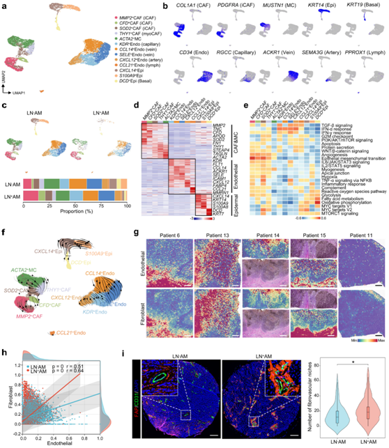 (a) UMAP图显示了所有基质细胞的景观。(b) 显示用于注释这些亚聚类的经典标记基因的特征图。(c) UMAP 图显示亚聚类LN + AM 和 LN - AM 中的比例。 (d) 热图呈现这些亚聚类的聚类特定基因。(e) 对这些亚聚类中选定的标志路径进行 GSVA 分析。 (f) RNA 速度分析展示了这些亚聚类的进化轨迹。 (g) 使用 ST-seq 数据显示组织切片中内皮细胞和成纤维细胞得分的空间特征图。 (h) 散点图显示内皮细胞(x轴)和成纤维细胞(y轴)之间的相关性。 (i) 多重 IHC 检测在 AM 切片中通过抗 FAP 和抗 CD31 检测到的纤维血管生态位的代表性图像,以及显示 LN – AM和 LN+ AM中纤维血管生态位数量的小提琴图。
