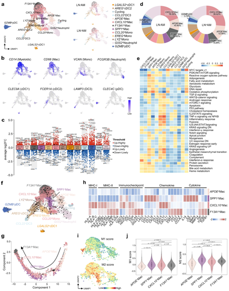 (a) UMAP图显示所有肿瘤样本的骨髓细胞景观。 (b) 特征图显示用于注释这些亚聚类的经典标记基因。(c) 火山图显示这些带注释的亚聚类中的 DEG。 (d) 饼图显示 LN + AM 和 LN – AM 组中这些骨髓细胞亚群的比例。 (e) 对这些亚聚类中选定的标志路径进行 GSVA 分析。 (f) RNA 速度分析展示了这些亚聚类的进化轨迹。(g) 巨噬细胞的伪时间排序分析。(h) 热图显示巨噬细胞亚群中选定免疫/炎症基因的表达水平。 (i) 特征图显示巨噬细胞亚聚类中 M1/M2 极化特征的得分。(j) 箱线图说明了巨噬细胞亚聚类中 M1/M2 极化特征的得分。