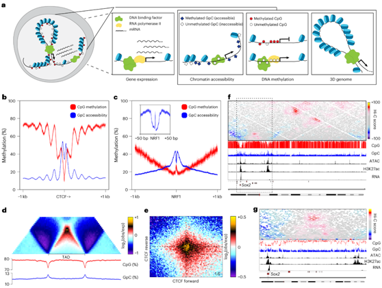 (a) 3DRAM-seq 的示意图。 (b) 以基序为中心和定向 CTCF ChIP-seq 峰(5 bp bin)的平均 CpG 甲基化和 GpC 可及性水平。(c) 与(b)相同,但针对以基序为中心的 NRF1 ChIP–seq 峰(2 bp bin)。(d) TAD 的平均接触富集、DNA 甲基化和 GpC 可及性水平。(e) ChIP-seq 峰内会聚 CTCF 基序之间的聚合接触富集。(f-g) 接触图和基因组轨迹显示了Sox2基因座的 DNA 甲基化、GpC 可及性、ATAC-seq、H3K27ac ChIP-seq 和 RNA-seq。