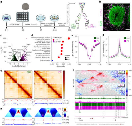 (a) 人类皮质类器官生成的实验概述。(b) 第 45 天皮质类器官内形成的神经玫瑰花结的代表性免疫荧光图像。(c) 散点图显示RGC-to-IPC分化中显著上调或下调的基因。 (d)GO分析。(e-f) CpG 甲基化和 GpC 可及性水平。(g) 3 号染色体(200 kb bin)的接触图(上)以及 CpG 甲基化和 GpC 可及性水平(下)。 (h) RGC 和 IPC 在 TAD 上的平均接触富集、CpG 甲基化和 GpC 可及性水平。 (i) SOX2基因座上 RGC 和 IPC 的接触图、GpC 可及性、DNA 甲基化和表达水平。