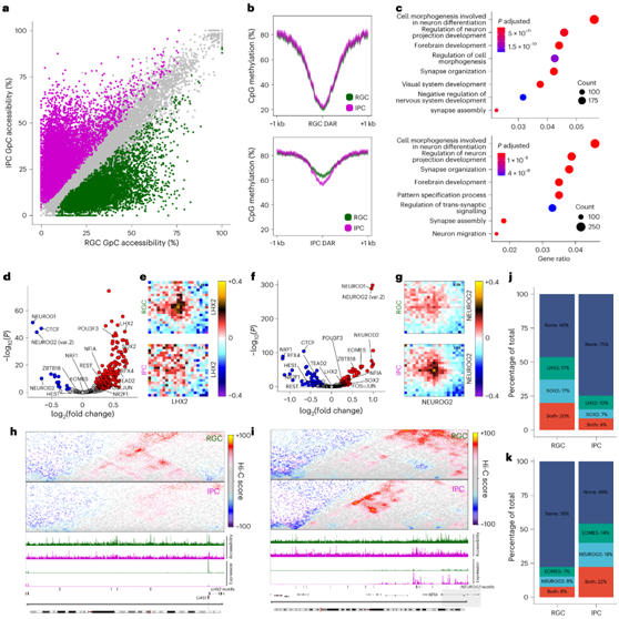 (a) 散点图显示 RGC 和 IPC 中各个 GPC 峰的 GPC 可及性水平。 (b)平均 CpG 甲基化水平。 (c) GO分析。(d) 火山图显示 RGC DAR 中 TF 基序的富集。(e) 含有 LHX2 基序的 RGC DAR 对的接触富集。 (f-g) 与(d-e)相同,但分别适用于 IPC DAR 和具有 NEUROG2 基序的 IPC DAR。 (h-i) GAS1和NFIA基因座的接触图、GpC 可及性水平以及 RGC 和 IPC 的基因表达。(j) 包含与 RGC 峰重叠的 LHX2 和/或 SOX2 基序的配对读数(间隔 100-300 bp)的单分子共可及性水平。 (k) 包含与 IPC 峰重叠的 EOMES 和/或 NEUROG2 基序的配对读数(间隔 100-300 bp)的单分子共可及性水平。