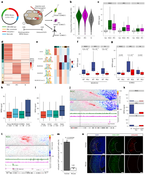 (a) 人类皮质类器官中immunoMPRA的实验概述。 (b) 小提琴图和箱线图,显示每个 CRE 获得的独特条形码的数量。(c) 箱线图显示对照和与 RGC或 IPC增强子 相关的显著活跃 CRE的 MPRA 信号。 (d) 所有细胞类型中显著活性cre的k -均值聚类。 (e) 热图显示五个重要 CRE 聚类的基序富集。 (f-g) 箱线图显示含有野生型 (WT) 或突变 (Mut) NEUROG2或 EOMES TF 基序的 IPC 中显著活跃的 CRE 的细胞类型特异性 MPRA 信号 。 (h-i) 箱线图显示包含所示基序的显著活跃的CRE在 IPC和 RGC中的 MPRA 信号。(j) PCDH9基因座上 RGC 和 IPC 的接触图、GpC 可及性和基因表达。(k) 条形图显示(j)中所示的 CRE在有或没有基序突变的情况下的 MPRA 活性。 (l) 与(j)相同,但针对FBXO32基因座。 (m) 条形图显示 通过 FACS 定量的GFP +细胞群中 mScarlet +细胞的百分比。 (n)代表性免疫荧光图像。