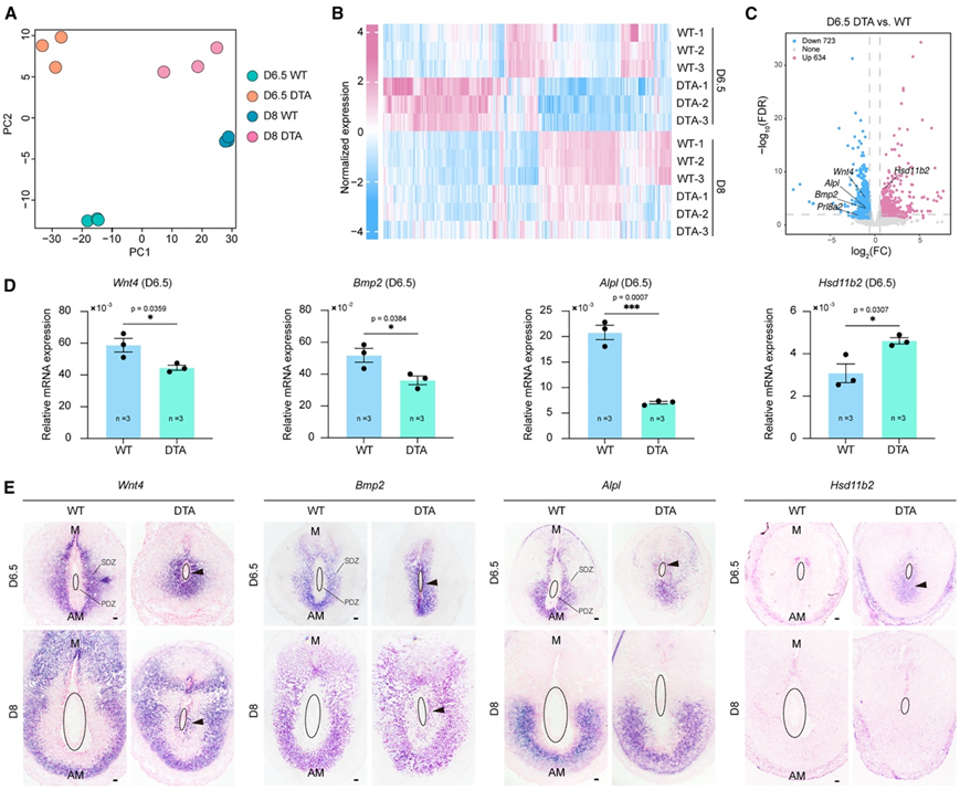 为了进一步研究 pTGC 缺失后蜕膜化受损的分子机制,他们在第 6.5 天和第 8 天对 WT 组和 DTA 组的子宫组织进行了转录组分析(RNA-seq)。通过转录组数据的主成分分析 (PCA),WT 组和 DTA 组之间的方差在第 6.5 天显著,并在第 8 天减小(图 2 A)。在第 6.5 天 DTA 与 WT 和第 8 天的比较中确定的所有差异表达基因(DEG)时,第 6.5 天 DTA 组在所有组中表现出最显著的差异趋势DTA 与 WT(图 2 B)。蜕膜化的关键基因,如Wnt4、Bmp2和Alpl,或与蜕膜功能相关的基因,如Hsd11b2,在蜕膜后6.5天表达异常(图2C)。通过实时荧光定量PCR (real-time qPCR)分析验证这些基因的变化(图2D)。除表达水平外,这些基因的时空表达模式在WT组和DTA组之间也存在差异。与之前的研究一致,Wnt4和Bmp2的表达在第6.5天和第8天定位于WT蜕膜的次级蜕膜区(SDZ)。然而,在DTA组中,Wnt4和Bmp2在推定PDZ的孕体附近表达(图2E)。同样,Alpl的表达在第 6.5 天 DTA 蜕膜中毗邻孕体的推测 PDZ 中显示受损定位(图 2 E)。此外,Hsd11b2在 D6.5 的 DTA 蜕膜推测的 PDZ 中出现异常表达(图 2 E)。其他基因,如Bmp7,在 DTA 蜕膜中也表现出区域化表达受损(图 S2)。这些数据表明 pTGC 的缺失导致推测的 PDZ 发育不良并扰乱时空蜕膜化。