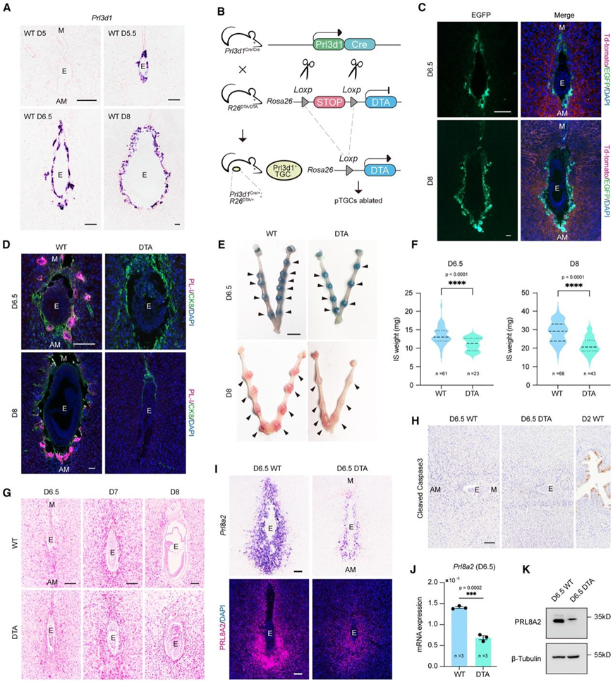(A) Prl3d1阳性TGC的敲除会损害妊娠早期的蜕膜化。(B) pTGC 敲除策略示意图。(C-D)免疫荧光分析。(E) WT 组和 DTA 组小鼠第 6.5 天和第 8 天子宫的代表性图像。(F) WT 和 DTA 小鼠在第 6.5 天和第 8 天的 IS 重量。(G) 妊娠早期 WT 和 DTA 胚胎的苏木精和伊红 (H&E) 染色表明第 8 天 DTA 子宫内的胚胎发育迟缓。(H)免疫组织化学染色。(I)第 6.5 天 WT 和 DTA 子宫中蜕膜标志物Prl8a2 mRNA(上)的原位杂交和 PRL8A2 蛋白(下)的免疫荧光染色。(J)第 6.5 天 WT 和 DTA IS 中Prl8a2的实时 qPCR 分析。(K)第 6.5 天 WT 和 DTA 子宫中 PRL8A2 的免疫印迹分析。