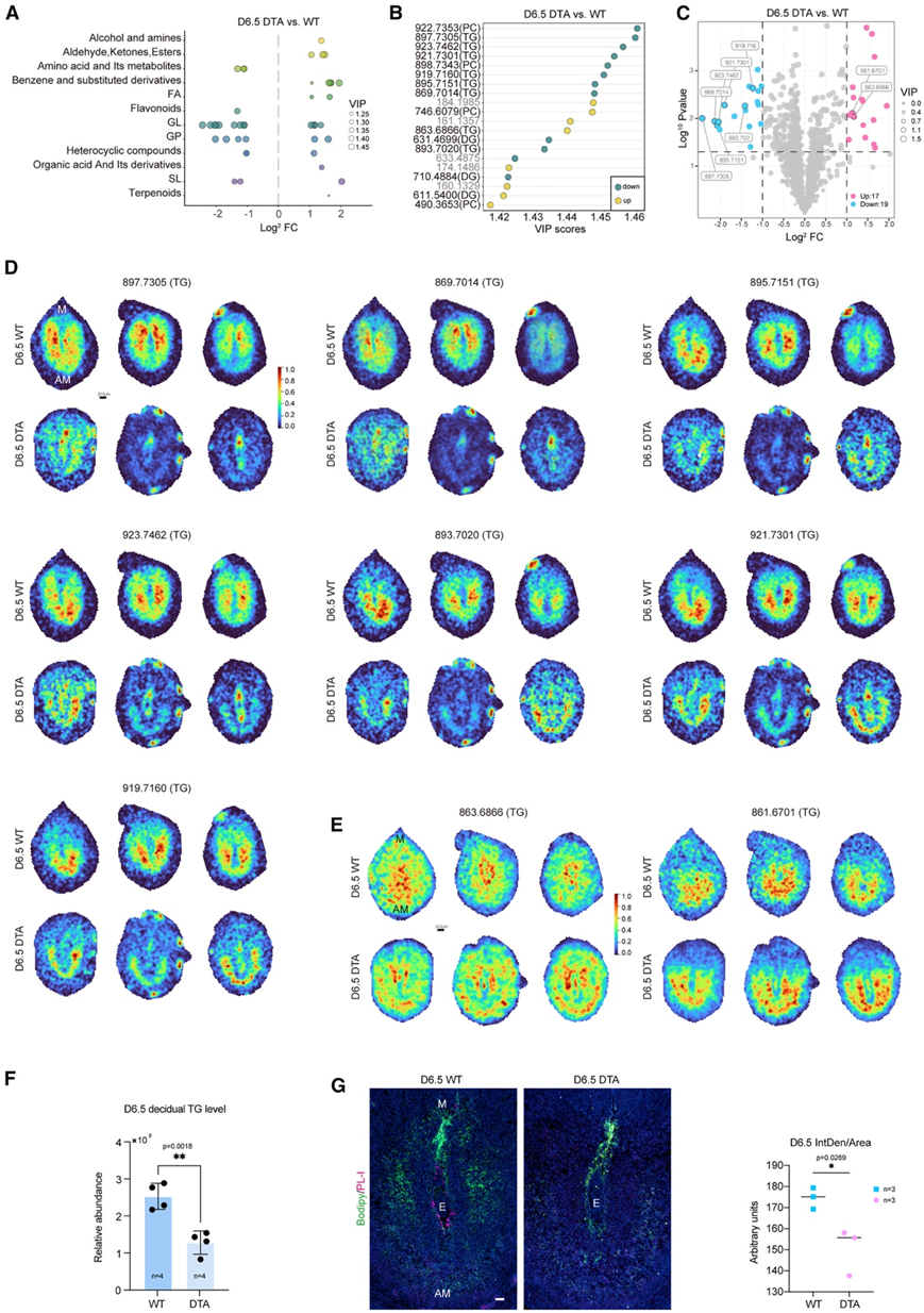 (A) 气泡图显示第 6.5 天 DTA 与 WT 蜕膜中差异代谢物相对含量的变化,按不同颜色表示的代谢物分类进行分类。(B) 气泡图显示第 6.5 天 DTA 与 WT 蜕膜中投影 (VIP) 评分中变量重要性最高的前 20 种代谢物。(C) 第 6.5 天 DTA 与 WT 蜕膜中差异代谢物的火山图。(D) 第 6.5 天 DTA 子宫中 TG 显著减少的离子图像。(E) 6.5 DTA 子宫中 TG 增加的离子图像。(F) 第 6.5 天 WT 和 DTA 蜕膜中总 TG 水平的相对定量。(G) 第 6.5 天 WT 和 DTA 子宫中脂滴的 Bodipy 荧光染色和 PL-I 的免疫荧光(左)。第 6.5 天 WT 和 DTA 子宫之间的荧光强度(右)。