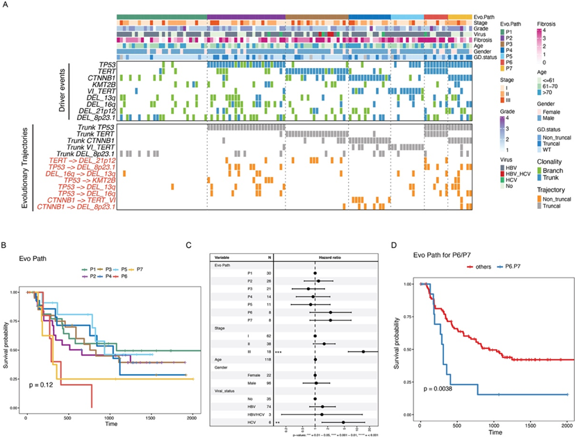 接下来,他们试图揭示临床特征与所识别的不同基因进化路径之间的关联。首先开始定义临床特征与七条路径之间的关联,然而,只有P7路径在非病毒性肿瘤中表现出富集。随后,他们检测了七条基因进化路径中患者TTR(无复发生存期)的差异。虽然将七个组分开时预后分层并不显著,但P6和P7显示出相对较差的预后(图2B-C)。事实上,当将P6和P7组合成一组时,即使在控制了其他临床变量(如肿瘤分期和病毒状态)之后,它们的预后也明显比其他路径差(图2D)。