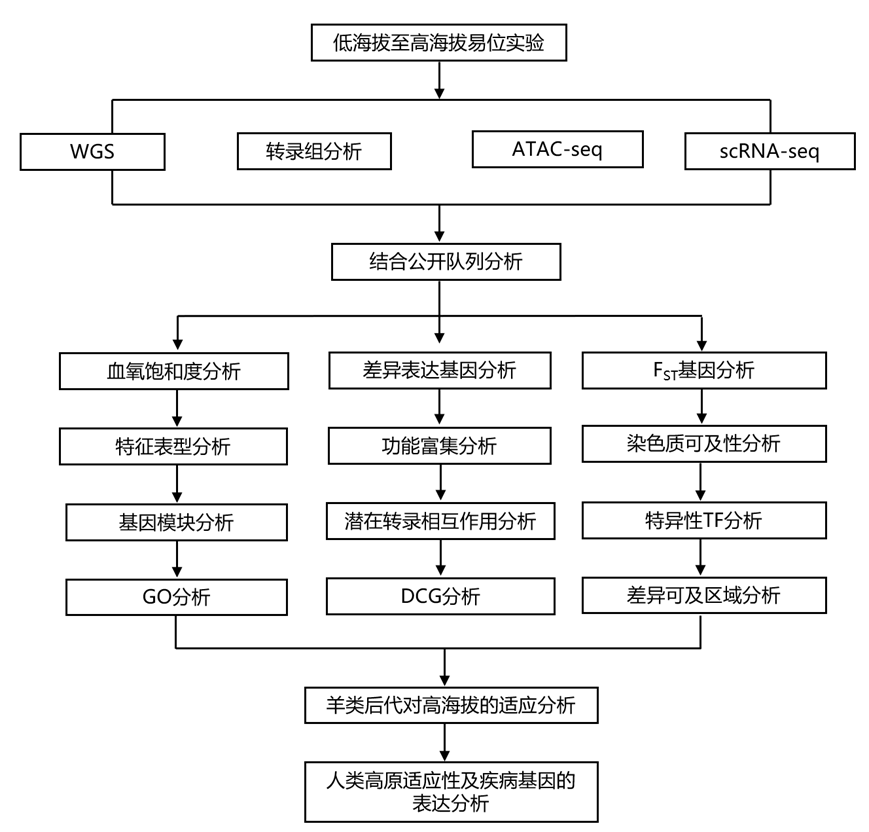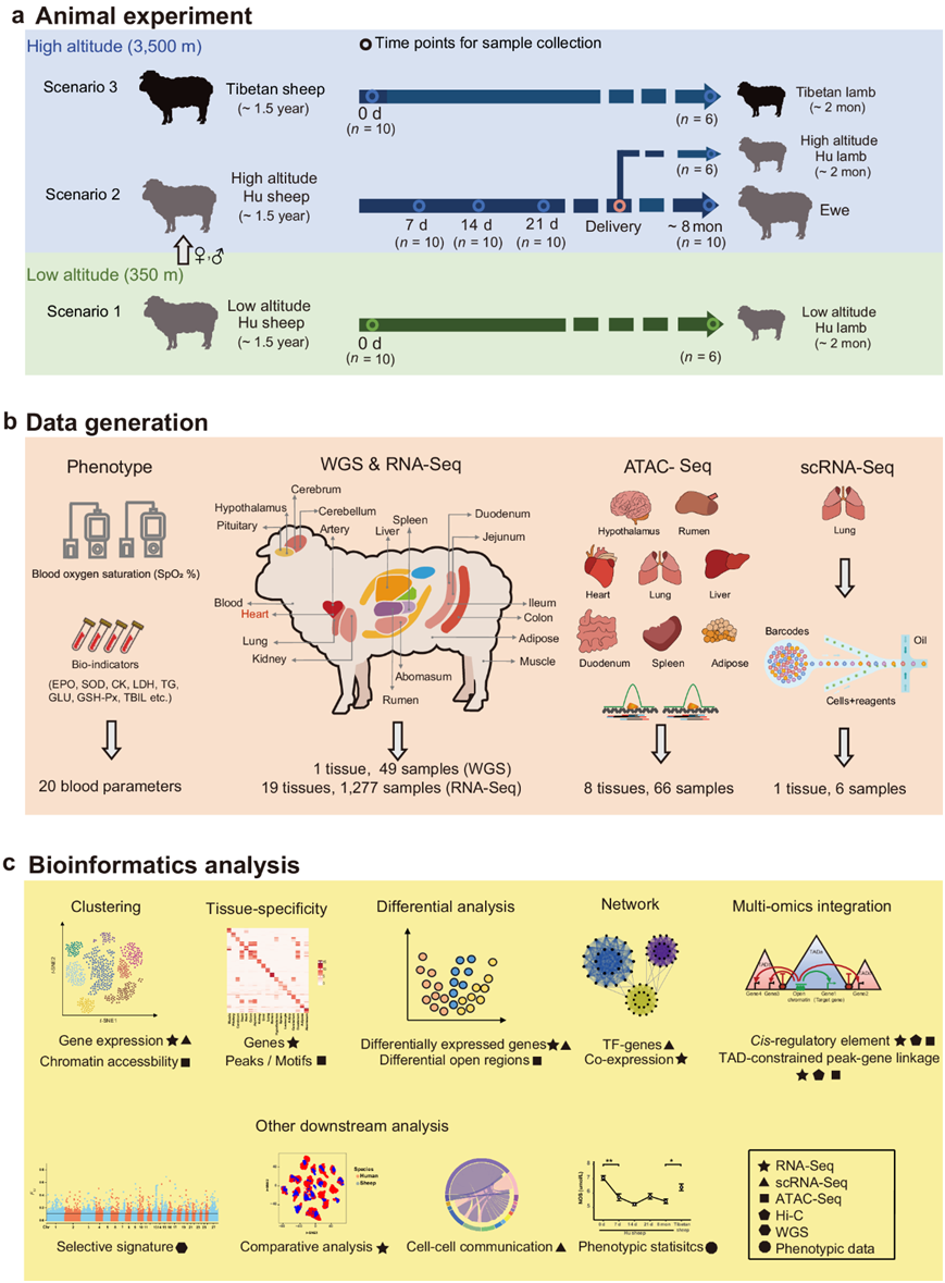 在本研究中,研究者团队在绵羊中进行了低海拔至高海拔易位实验(图 1a),并产生了多层数据(图 1b),包括全基因组测序(WGS)、转录组分析(RNA-seq)、染色质可及性分析(ATAC-seq)和单细胞转录组分析(scRNA-seq)数据,以及血液生理生化表型。本项研究的目的是(1)确定组织中短期缺氧反应的时间序列表达变化和调控元件;(2)揭示与人类高海拔适应和疾病有关的基因的多组织表达模式;(3)测试后代对缺氧的适应。