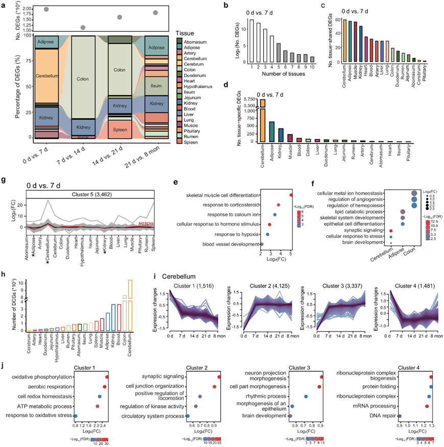 (a) 组织间相邻时间点比较的差异表达基因 (DEG) 数量和 DEG 百分比。(b) “ 0 天与7 天” 中 DEG 在不同组织中的分布。(c-d) “ 0天与7天” 比较中组织间组织共有和组织特异性DEG 的数量。(e-f) GO分析。(g)多组织相互作用。(h) 组织间动态变化基因 (DCG) 的数量。(i) 模糊c均值聚类确定了小脑 DCG 的基因表达模式。(j) 四个聚类中的GO分析。