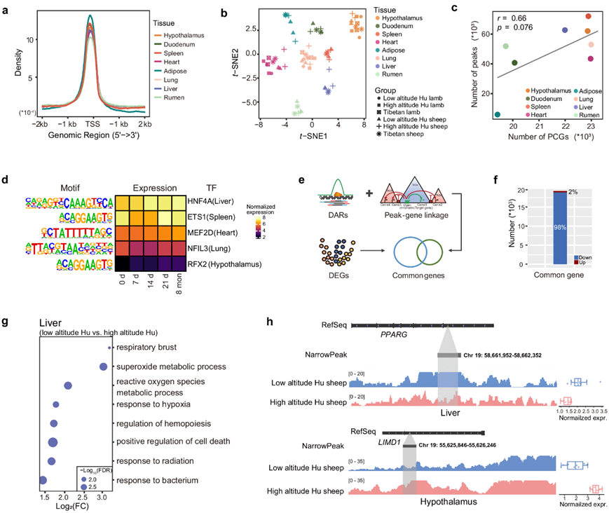 (a)各组织在相对于转录起始位点(TSS)的位置处的平均峰密度。(b) 基于峰信号密度的66个样本的t -SNE聚类。(c) 各组织中表达基因数量与检测到的峰之间的Pearson相关性。(d) 各个组织的差异可及区域(DAR)中的组织特异性转录因子(TF)及其随时间的基因表达。(e) 常见基因的鉴定。(f) 上调和下调的峰基因对的数量。(g) 低海拔羊和高海拔羊肝脏的常见基因比较,在与缺氧反应相关的生物学过程中富集。(h) 常见上调和下调基因的示例。