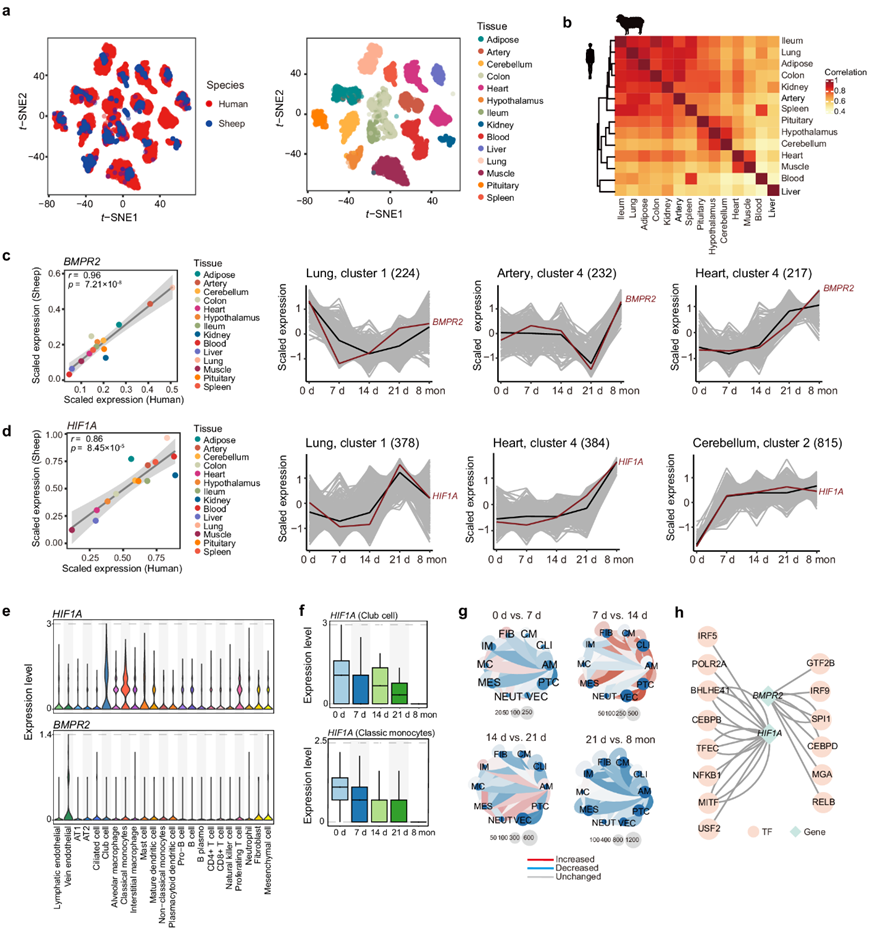 (a) 人类和羊 14 种常见组织的转录本的保守性。(b) 基于 TPM 中值 Pearson 相关性对人类和羊常见组织进行层次聚类。(c-d) 人类肺动脉高压(即BMPR2)和高海拔适应(即HIF1A)的基因示例。(e) BMPR2和HIF1A在肺中不同细胞类型的表达。(f) 肺中棒状细胞(上)和经典单核细胞(下)中 HIF1A 的表达随时间的变化。(g)相邻时间点比较中BMPR2和HIF1A差异表达细胞类型的细胞间通讯结果。(h) 调节HIF1A和BMPR2 的TF。