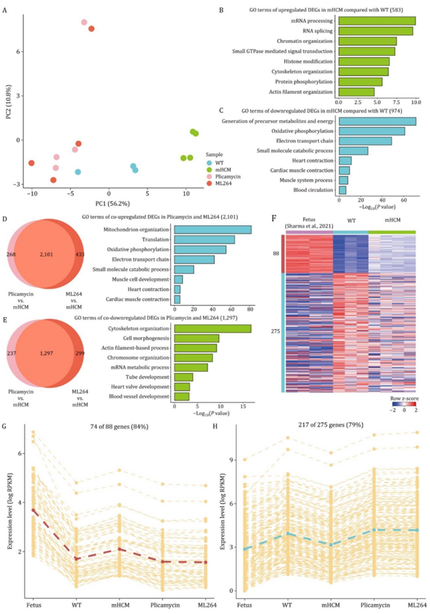 (A) PCA图显示了用普卡霉素或ML264处理的WT小鼠、HCM小鼠和HCM小鼠中蛋白质编码基因的转录组模式。(B-C) GO分析。(D) 维恩图显示了普卡霉素或ML264处理的HCM小鼠与HCM小鼠之间重叠上调deg的数量。(E) 维恩图显示了用普卡霉素或ML264处理的HCM小鼠与HCM小鼠之间重叠下调deg的数量。 (F) 热图显示了与WT小鼠相比,HCM小鼠和胎儿中共上调和共下调deg的行z分数刻度基因表达水平。(G) 线形图显示74个基因的表达水平,这些基因在HCM小鼠和胎儿中与WT小鼠相比共上调,而在普卡霉素和ML264处理的HCM小鼠中与HCM小鼠相比共下调。(H) 线形图显示了217个基因的表达水平,这些基因在HCM小鼠和胎儿中与WT小鼠相比共下调,在普卡霉素和ML264处理的HCM小鼠中与HCM小鼠相比共上调。