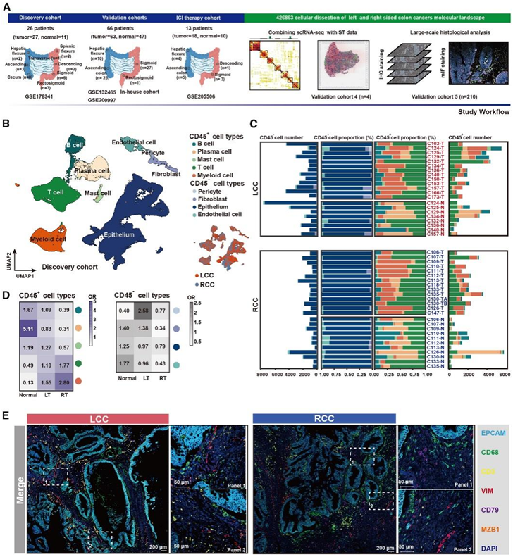 (A)本研究样本采集及分析过程。(B)UMAP可视化。(C)单个样本正常粘膜和结肠肿瘤组织中主要细胞类型的比例,按左结肠癌(LCC)和右结肠癌(RCC)分组。(D)热图显示各组织中主要细胞类型的优势比(OR)。(E)左右两侧肿瘤组织中的多重免疫组化(mIHC)染色分析。