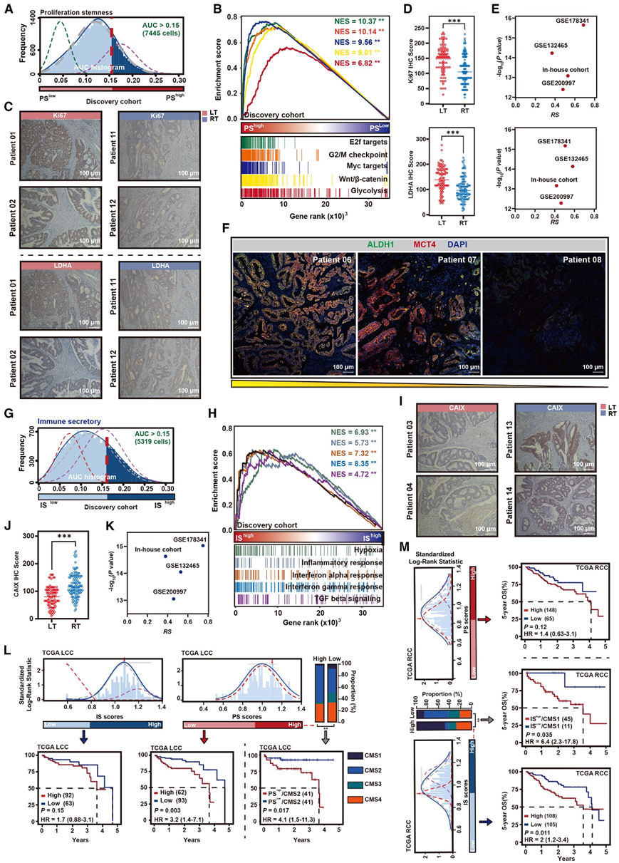(A) 尖峰图显示左侧恶性结肠上皮的 PS AUCell 评分分布。(B) GSEA 中 PShigh与 PSlow左侧恶性结肠上皮的前 5 种富集通路。(C) 验证队列 5 中的 Ki-67和 LDHA的 IHC 染色。(D) 左侧和右侧结肠肿瘤组织中 Ki67 和 LDHA 染色评分的分布。(E) 左侧恶性结肠上皮的 PS 评分与有氧糖酵解评分和 MCT4表达之间的 Spearman 相关性。(F) LT 的代表性 mIHC 染色。(G) 峰值图显示右侧恶性结肠上皮中 IS AUCell 评分分布。(H) GSEA 中 IShigh与 ISlow右侧恶性结肠上皮的前 5 种富集通路。(I) LT 和 RT 中的 CAIX 的 IHC 染色(验证队列 5)。(J) 左侧和右侧结肠肿瘤组织中 CAIX 染色评分的分布(验证队列 5)。(K) 右侧恶性结肠上皮的 IS 评分和缺氧评分之间的 Spearman 相关性。(L) 尖峰图显示 LCC 患者中不同 PS 和 IS的标准化对数秩统计量。(M) 尖峰图显示具有bulk RNA-seq数据 (TCGA-COAD) 的 RCC 患者中不同 PS 和 IS的标准化对数秩统计量。