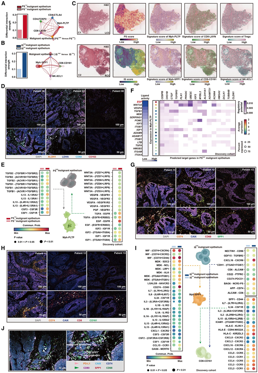 (A) 条形图分别显示 PShigh和 PSlow恶性上皮与 LT 中的免疫细胞之间的通信强度。(B) 条形图分别显示 IShigh和 ISlow恶性上皮与 RT 中的免疫细胞之间的通信强度。(C) 细胞空间特征图。(D) LT 中ALDH1 +恶性上皮和 CD163 +巨噬细胞的代表性 mIHC 染色。(E) 与 PSlow恶性上皮相比,LT 中PShigh恶性上皮与 Mph-PLTP 细胞之间的信号配体-受体对上调。(F) 根据 NicheNet 推断出 Mph-PLTP 细胞调节 PShigh恶性上皮的配体。(G-H) mIHC 染色的代表性图像。(I) RT 中 IShigh恶性上皮与 Mph-SPP1 细胞和 CD8-CD161 细胞之间的信号配体-受体对上调,而 ISlow恶性上皮则相反。(J) 代表性 mIHC 染色。