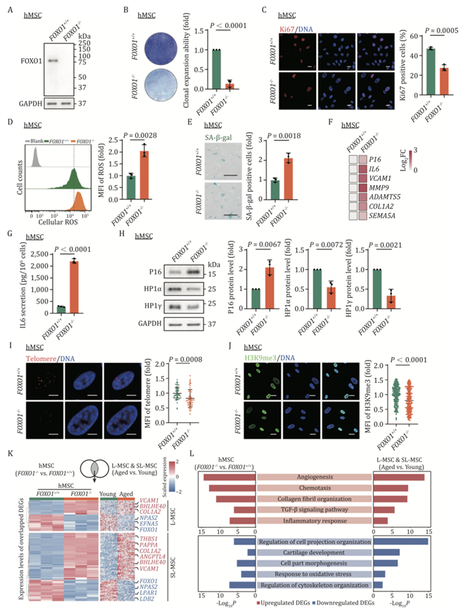 (A)免疫印迹。(B) 克隆扩增分析。(C) 免疫荧光分析。(D) 流式细胞分析。(E) SA-β-gal 染色。(F) qPCR 分析。 (G) 酶联免疫吸附试验 (ELISA) 分析。(H)免疫印迹分析。(I) DNA-FISH 检测FOXO1+/+和FOXO1 –/– hMSC 中的端粒。(J) 免疫荧光分析。(K) 热图显示 snRNA-seq(L-MSC 和 SL-MSC)与FOXO1–/–和FOXO1+/+hMSC 之间的bulk RNA-seq 之间重叠的 DEG 表达谱。(L) 重叠的上调和下调 DEG 的代表性通路。
