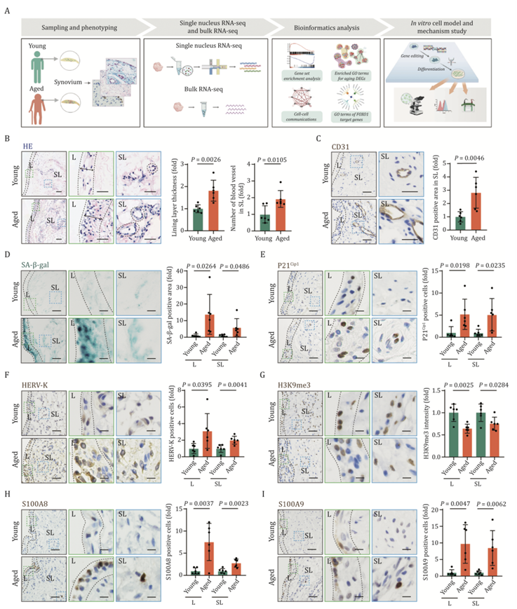 (A)与人类滑膜衰老有关的细胞和分子调控网络的实验设计示意图。(B)年轻和老年人类滑膜组织的 HE 染色。(C) 年轻和老年人类滑膜组织中 CD31 的免疫组织化学 (IHC) 染色。 (D) 年轻和老年人类滑膜组织的 SA-β-gal 染色。(E) 年轻和老年人类滑膜组织中细胞衰老相关标志物 P21 Cip1的 IHC 染色。 (F) 年轻和老年人类滑膜组织中 HERV-K 的 IHC 染色。(G) 年轻和老年人滑膜组织中 H3K9me3 的 IHC 染色。(H) 年轻和老年人滑膜组织中 S100A8 的 IHC 染色。(I) 年轻和年老人类滑膜组织中 S100A9 的 IHC 染色。