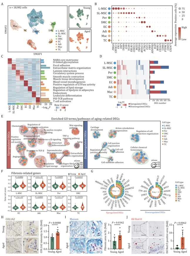 (A) 均匀流形近似和投影 (UMAP) 图显示年轻和老年人类滑膜组织中不同细胞类型的分布。(B) 点图显示滑膜中每种细胞类型的代表性标记基因的表达。(C) 热图显示年轻和老年人类滑膜组织中不同细胞类型的前 50 种标记基因的表达谱,右侧为其富集的功能注释。(D) 热图和条形图显示衰老相关 DEG。(E)GO分析。(F) 小提琴图显示年轻和老年人类滑膜组织不同细胞类型中纤维化相关基因的基因集得分。(G) 圆形图显示至少四种或三种细胞类型共有的上调(左)和下调(右)的 DEG。(H) 年轻和老年人类滑膜组织中 COL1A2 的 IHC 染色。(I)年轻和老年人类滑膜组织的 Masson 染色。(J) 年轻和老年人类滑膜组织的油红 O 染色。