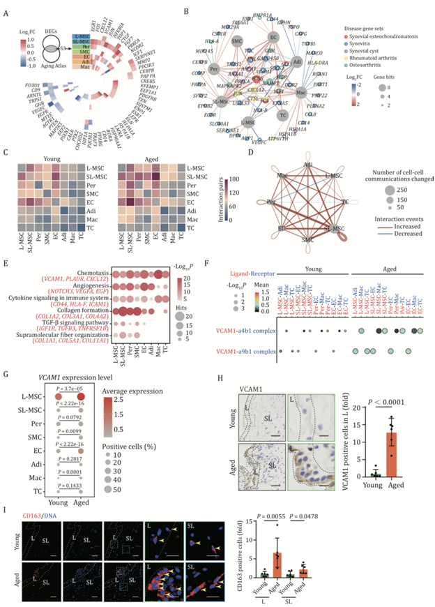 (A) 热图显示老化图谱数据库中注释的不同细胞类型的老化 DEG。(B) 网络图显示老化相关 DEG 与滑膜疾病基因集的相关性。(C) 热图显示年轻组和老年组中人类滑膜中所示细胞类型之间的相互作用对数量。(D) 网络图显示滑膜老化过程中不同细胞类型之间细胞-细胞相互作用对的变化。(E) 点图显示滑膜老化过程中增加的细胞-细胞相互作用对的代表性富集功能注释。(F) 点图显示年轻组和老年组中所示细胞类型中 VCAM1 相关细胞间相互作用对。(G) 点图显示滑膜老化过程中不同细胞类型中 VCAM1 的表达水平。(H) 年轻和老年人类滑膜组织中 VCAM1 的 IHC 染色。(I) 年轻和老年人类滑膜组织中 CD163 的免疫荧光染色。