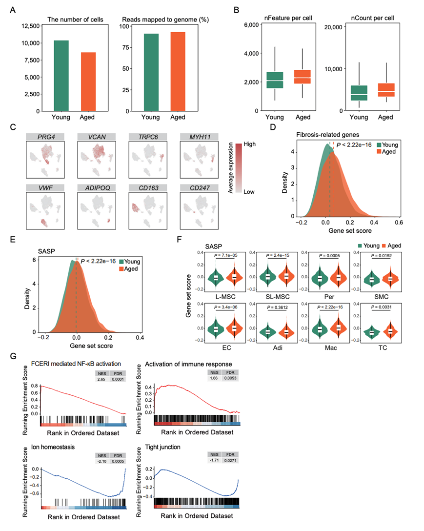 (A) 条形图显示每组的细胞数量和映射到基因组的读数百分比。(B) 箱线图显示了不同组中每个细胞中检测到的基因数量和唯一分子标识符的数量。(C)UMAP可视化。(D) 显示年轻和老年人类滑膜组织纤维化相关基因集评分的全球分布密度的Ridge图。(E) 显示年轻人和老年人滑膜组织SASP基因集评分的全局分布密度的脊图。(F) 小提琴图显示SASP在不同细胞类型的年轻和老年人类滑膜组织中的基因集评分。(G) GSEA富集曲线显示了bulk RNA-seq检测的衰老相关通路的变化。