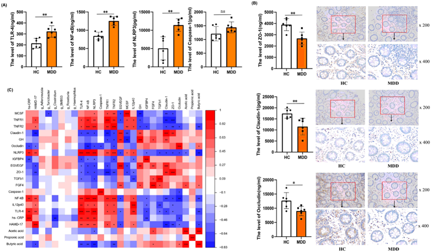 为了进一步阐明炎症途径并量化肠道通透性标志物,他们进行了酶联免疫吸附试验 (ELISA)分析。MDD 组的 TLR-4、NF-κB 和 NLRP3 水平升高(图 2A)。Claudin-1、ZO-1 和 Occludin 等通透性生物标志物的水平降低(图 2B)。相关性分析显示, Clostridium相对丰度与MCSF、hs-CRP水平呈负相关,炎症因子与通透性生物标志物(Claudin-1、ZO-1、Occludin)及SCFA(乙酸、丙酸、丁酸)呈负相关,与HAMD-17总分呈正相关;丁酸水平与Occludin呈正相关,与TLR-4、NF-κB、NLRP3、TNFR2、HAMD-17呈负相关;Claudin-1与GH、EG-VEGF等肠黏膜修复标志物呈正相关(图 2C)。