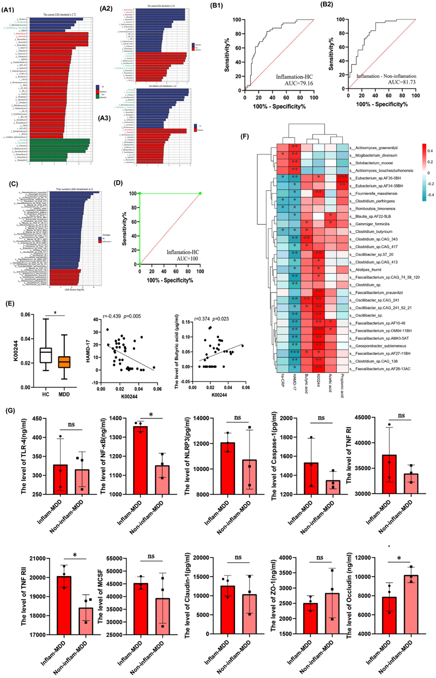 (a) 为明确炎症抑郁症肠道菌群特点,对三组进行LEfSe分析。(b) 为确定在属水平上区分炎症抑郁症与HC、炎症抑郁症与非炎症抑郁症的生物标志物,将各属合并制作受试者工作特征(ROC)曲线,ROC分析显示AUC分别为81.73%和79.16%。 (c) 对肠道菌群进行宏基因组测序分析。(d) 结合所有不同物种制作了ROC曲线。(e) K00244的表达在炎症抑郁症组中显著降低。(f) 相关性分析。(g) 炎症抑郁症患者肠黏膜炎症因子及通透性生物标志物分析。