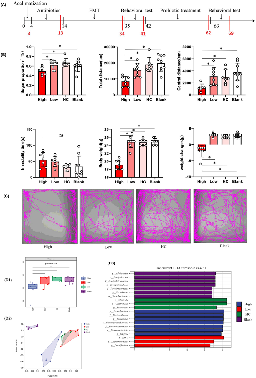 (A)小鼠治疗和行为测试示意图。 (b) 肠道菌群悬浮液比较。(c) OFT中小鼠的运动轨迹。 (d1-3) Alpha 多样性分析、Beta 多样性分析、LEfSe 分析。