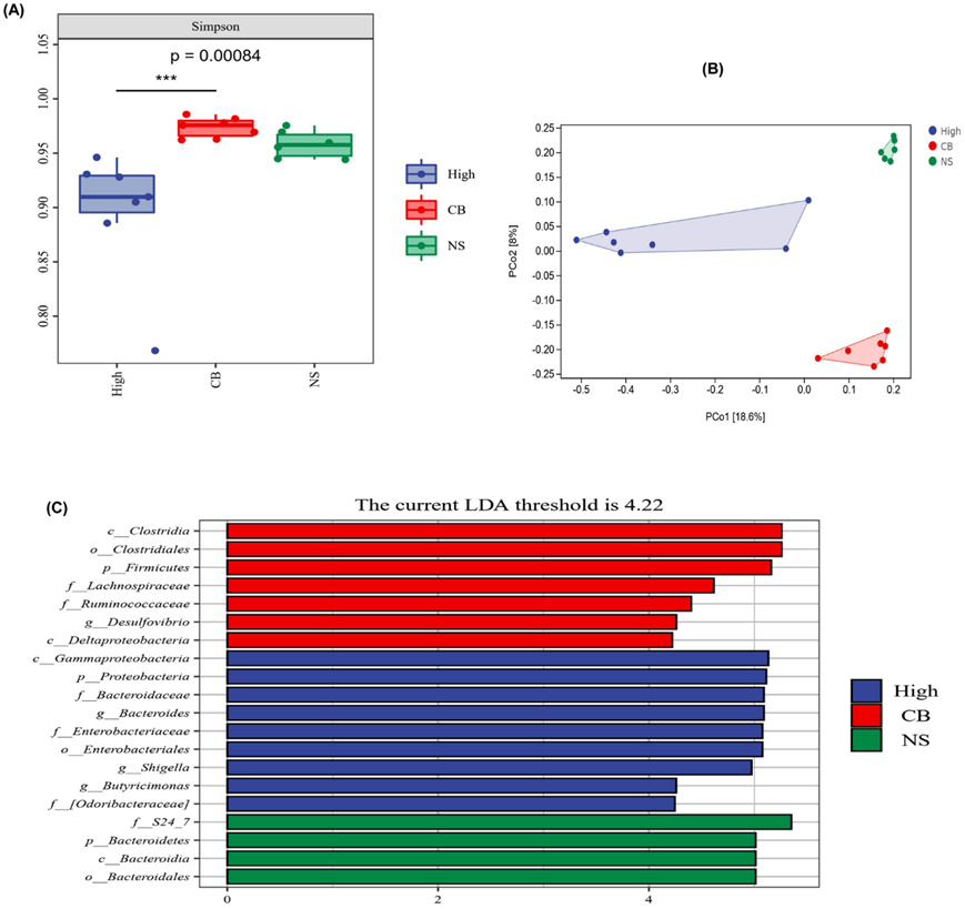 总体而言,他们发现在高炎症小鼠中促炎细菌的丰度增加,而抗炎细菌的丰度降低。为了进一步研究高炎症小鼠肠道菌群与抑郁症状之间的关系,他们给高炎症小鼠补充了产丁酸的抗炎细菌(CB),通过 alpha 多样性分析发现 CB 组的 Simpson 指数增加(图 6A)。还通过 beta 多样性分析发现,高炎症组和 CB 组的细菌群落组成存在明显差异(图 6B)。此外,LEfSe 分析显示 CB 组中梭菌的丰度增加,拟杆菌的丰度降低(图 6C)。