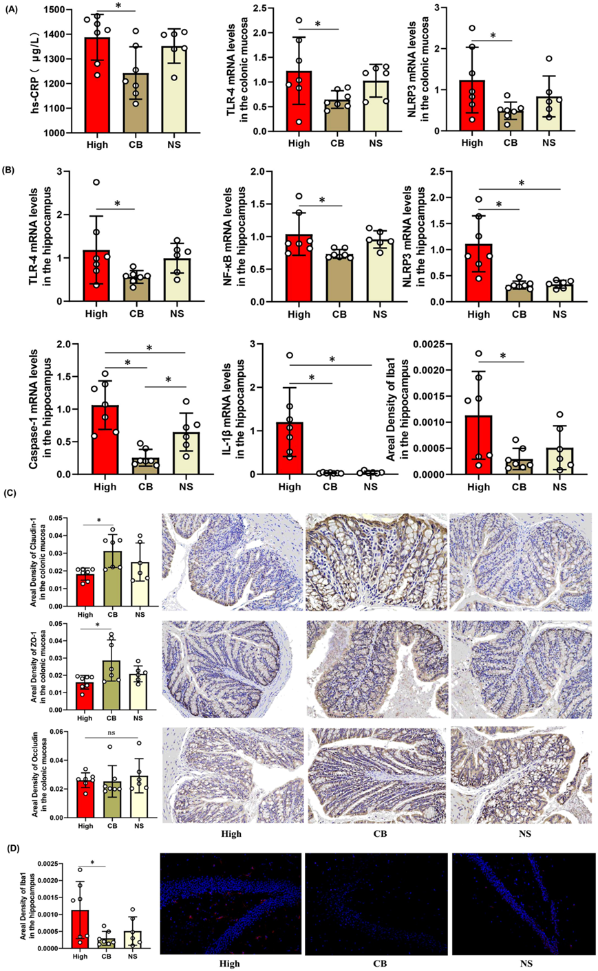 (a) CB 降低了 肠黏膜中TLR-4、NLRP3的表达以及血清中 hs-CRP 的浓度。 (b) CB降低了脑中 TLR-4、NF-κB、NLRP3和 Caspase-1的表达。 (c) ELISA 和免疫组化分析。(d) CB 组海马小胶质细胞的面密度、数量和分支减少。