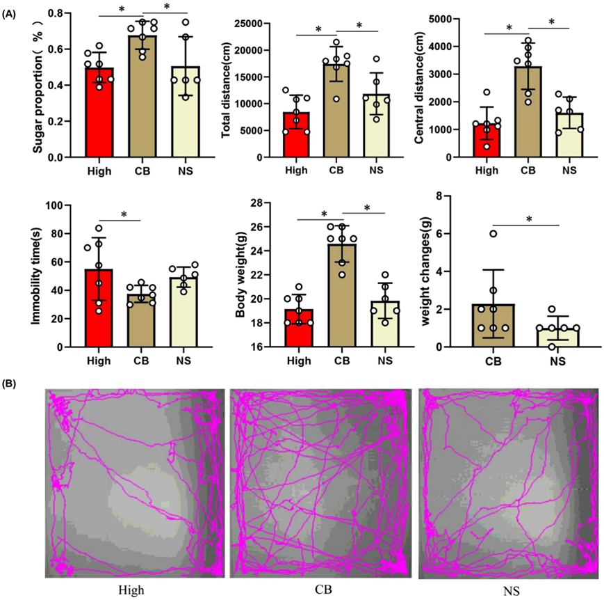 此外,使用行为测试评估抑郁样行为。在 SPF 中,CB 组小鼠消耗的蔗糖比高炎症组或生理盐水 (NS) 组更多。在 OFT 中,CB 组小鼠活动增加(总行进距离更长)且焦虑减少(在远离墙壁的暴露中心区域行进更多)。同样,CB 组小鼠在 TST 中的不动持续时间减少。小鼠体重显著增加,并且 CB 组体重变化更大(图 8A-B)。