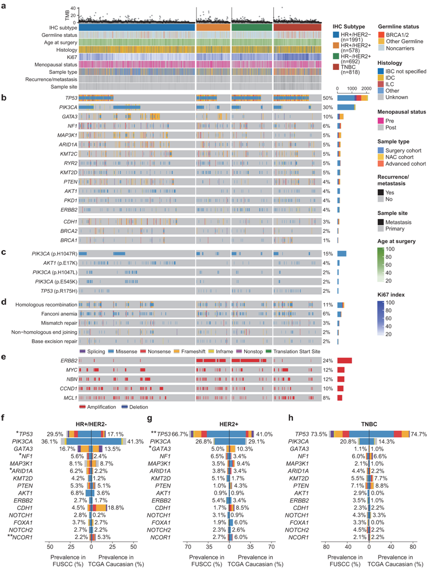 (a) 共有 4079 个具有临床数据的乳腺癌样本按分子亚型和突变谱进行排序。(b) 前 13 个体细胞改变基因在至少 4% 的病例中发生突变(上);体细胞CDH1和BRCA1/2突变(下)。(c) 中国人群中的热点突变(频率> 2%)。 (d) FUSCC-BC 队列中的 DDR 途径突变。 (e) 按分子亚型分类的癌症相关基因的拷贝数变异 (CNV) 。(f-h) FUSCC 和 TCGA 白种人队列之间HR+ /HER2–、HER2+和 TNBC 亚型体细胞突变的比较。