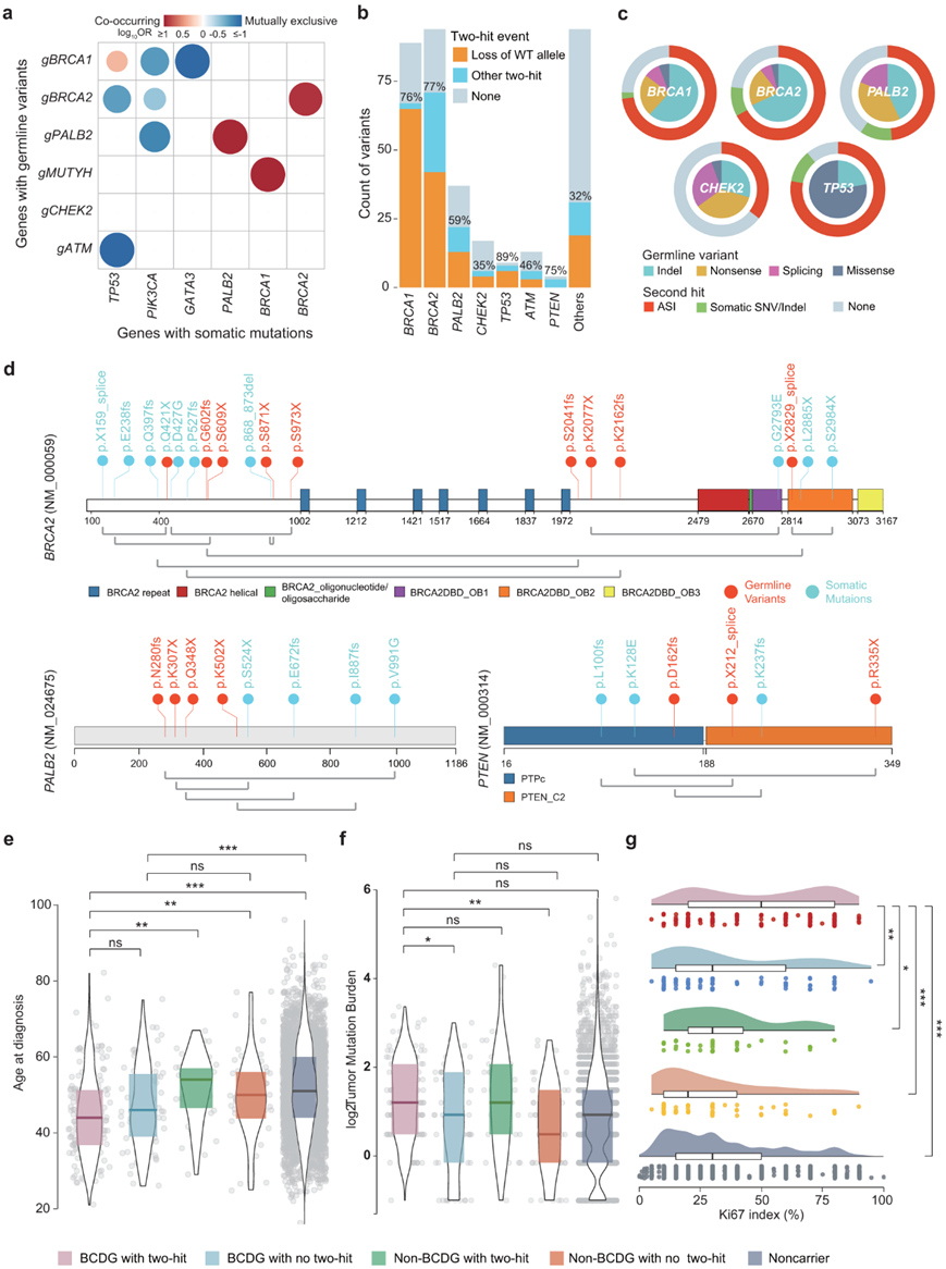 (a) 种系变异和体细胞突变之间显著的共现(红色)和相互排斥(蓝色)。(b) 种系变异计数显示癌症易感基因中各种类型的两次命中事件。 (c) BCDG 变体中致病性种系变体(内环)和两击(外环)的百分比和类型,包括BRCA1、BRCA2、PALB2、CHEK2和TP53变体。 (d) BRCA2、PALB2和PTEN中同一基因的致病变异双等位基因事件与体细胞突变相结合。 (e-g) 两击失活的BCDG突变携带者、未两击失活的BCDG携带者、其他两击失活的种系携带者、其他未两击失活的种系携带者和非携带者的诊断年龄、TMB和Ki67指数比较。