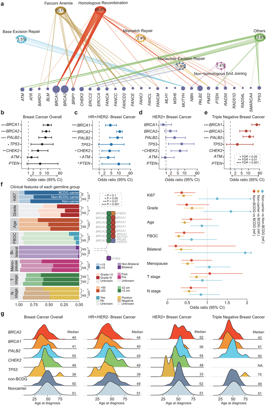 (a) DDR 途径中致病性种系变异的流行。(b-e) 总体乳腺癌风险和与致病性种系变异相关的分子亚型。(f) 按 BCDG 突变分类的每个种系突变组的临床特征比较。(g) 根据不同分子亚型中的每个种系突变组比较诊断时的年龄。