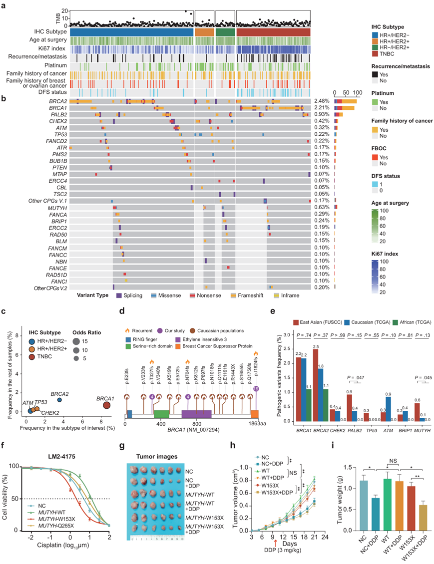 (a-b) FUSCC-BC 队列中的致病性种系变异谱。 (c) 同分子亚型中种系变异的显著富集。(d) 高频率BRCA1致病变异在高加索人群中的分布。(e) FUSCC-BC、TCGA高加索和TCGA非洲人群种系改变的比较。(f)细胞活力分析。(g-i) 肿瘤图像、体积定量和肿瘤重量结果。