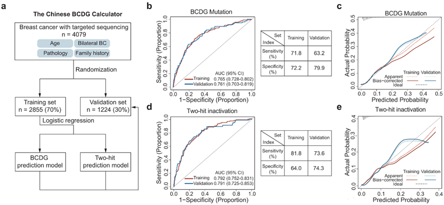 (a) 建立 BCDG 突变和两击失活预测模型的工作流程。(b) BCDG突变预测模型在训练集(红色)和验证集(蓝色)中的ROC曲线。 (c) 训练集(红色)和验证集(蓝色)中 BCDG 突变模型的预测概率和实际概率的校准图。 (d) 训练集(红色)和验证集(蓝色)中两击失活预测模型的 ROC 曲线。 (e) 训练集(红色)和验证集(蓝色)中两击失活模型的预测概率和实际概率的校准图。