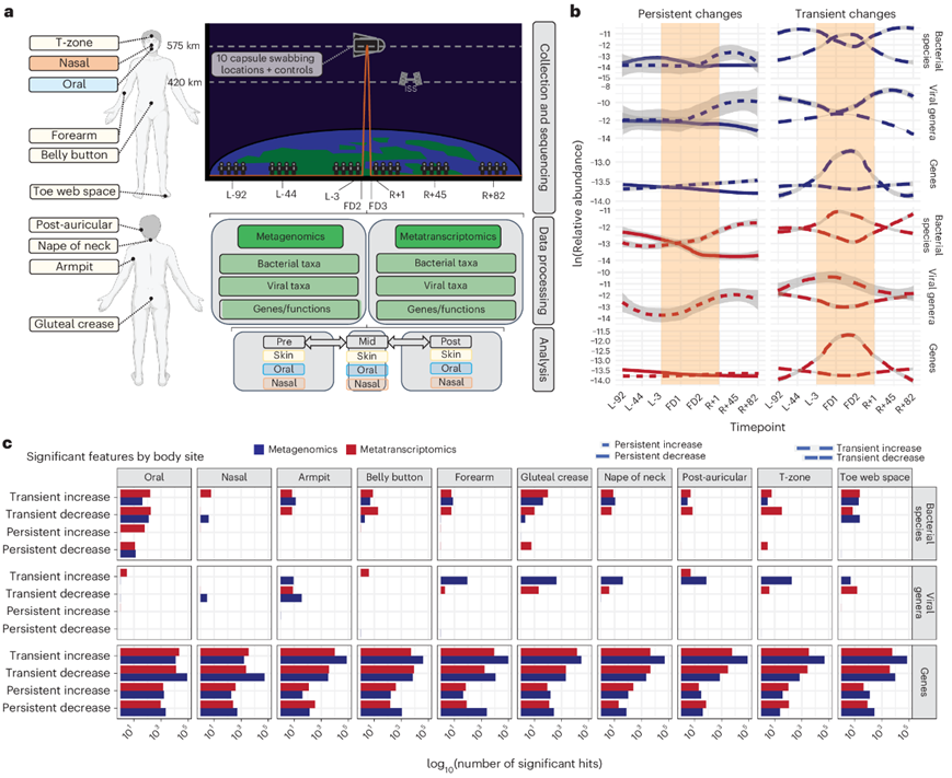 本项研究进行了一项为期六个月的纵向研究,以量化四个人在轨道上三天的高分辨率人类微生物组反应。使用配对宏基因组学和宏转录组学以及单核免疫细胞分析,在太空飞行前、中、后八个时间点对 750 个样本和 10 个身体部位进行了时间依赖性的多界微生物组变化描述,发现大多数改变都是身体部位的短暂性变化;例如,病毒在皮肤部位增加主要是在飞行期间。然而,在口腔微生物组中观察到了更长期的变化,包括与牙菌斑相关的细菌(例如梭杆菌)的增加,这与免疫细胞基因表达相关。此外,与噬菌体活性、毒素-抗毒素系统和应激反应相关的微生物基因在多个身体部位富集。总的来说,这项研究深入描述了宇航员在短期太空飞行期间经历的微生物组和免疫反应变化以及相关的生活环境变化,这有助于指导未来的任务、航天器设计和太空栖息地规划。