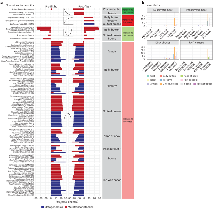 (a) 在所有测序方法中,发现与飞行前或飞行后时间点具有统计学相关性的特征(细菌种类、病毒属或基因)总数。(b) 按身体部位划分的持续/暂时增加/减少的显著发现的时间轨迹。